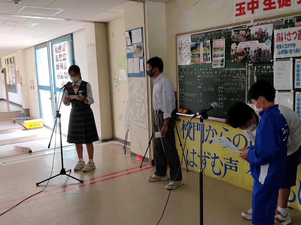 6.3 放送による中総体壮行式を行いました 6月1日(火)から3日(木)までの間,応援委員会が中心になって放送による中総体壮行式を行いました。各部の部長から中総体に向けた決意発表があり,生徒会長や応援委員長から激励の言葉が述べられました。また,最後に校長先生から熱い激励の言葉をいただきました。玉川中学校の代表として,最後まで頑張ってください。