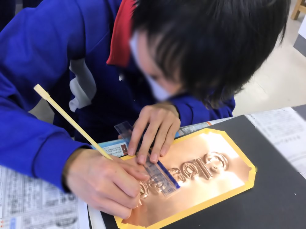 12月15日(水)に,2年ものづくり体験教室を行いました。この教室は,厚生労働省の支援により,各県の職業能力開発協会などの団体が,学校に講師を派遣して,生徒にものづくりを体験させる事業です。今回は,建築板金で「銅板レリーフ」,建具製作で「スマホ置き」,表装で「からくり蝶番」を教わりました。難しい過程がたくさんありましたが,講師の先生方が丁寧に教えてくれたので,全員が時間内に作品を完成させることができました。生徒だけはでなく,講師の先生方も「楽しかった」と笑顔になれた時間でした。